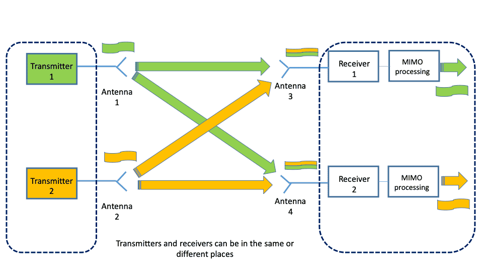 In cellular communications, transmitting and receiving operations are traditionally performed at the base station and mobile phone. The traditional resources that enable wireless transmission are frequency and time. With the adoption of MIMO, we are able to transmit and receive information using a new resource: the different antennas.