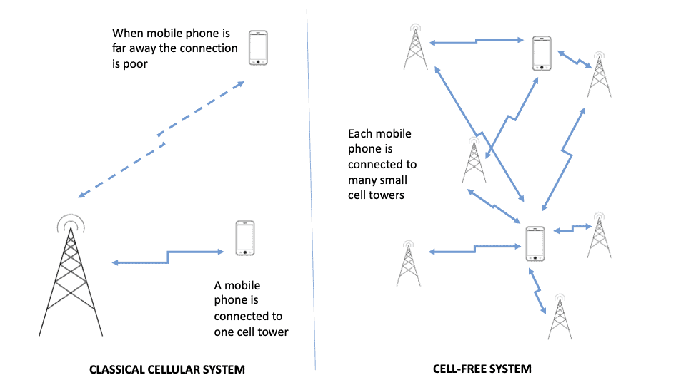 Another option is cell-free massive MIMO [6], wherein a large number of distributed, low-cost and low-power antennas cooperate through a centralized controller to serve a smaller number of users. Each of them may be served by all or by a subset of the antennas denoted as “user centric.” In any case, the concept of cell disappears, since a particular user is no longer attached to a single cell tower but rather connected to many (probably smaller) access points. As a consequence, the link quality is more evenly distributed among all users because they will always have some access point that is close enough to deliver a good signal, as opposed to some users being too far away from the cell tower in a classical system (often denoted as cell-edge users). Figure 2 illustrates the classical cellular and new approach.